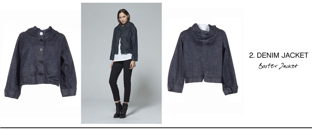 - DENIM JACKET – Denim jackets seem to have been around forever and they are here to stay - so make sure your wardrobe has one! Choose one which can be teamed with black pants and a black or white t-shirt. Any outfit with a denim jacket will instantly exude effortlessly chic while requiring minimum effort to style. Choose a jacket with a modern twist just like our Barter Jacket. This one has been so popular we have had to recut it - so don’t miss out this time!