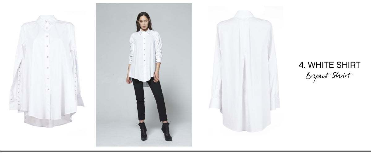 - WHITE SHIRT – A white shirt is the holy grail when it comes to fashion. Its diversity to lend itself to so many different looks with a simple accessory change is what has made it a fan favourite. Our Bryant Shirt is a true classic with hidden features such as sleeves that can be split open to reveal the lower arms and buttons on the back which can open up to add volume and interest.