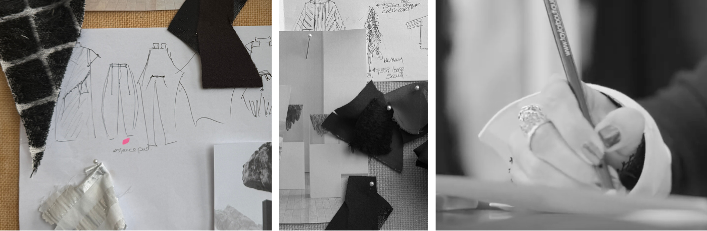 From here, inspiration is explored, garments are sketched and workshoped, the archive is revisited to bring shape inspiration, and the collection slowly takes shape.